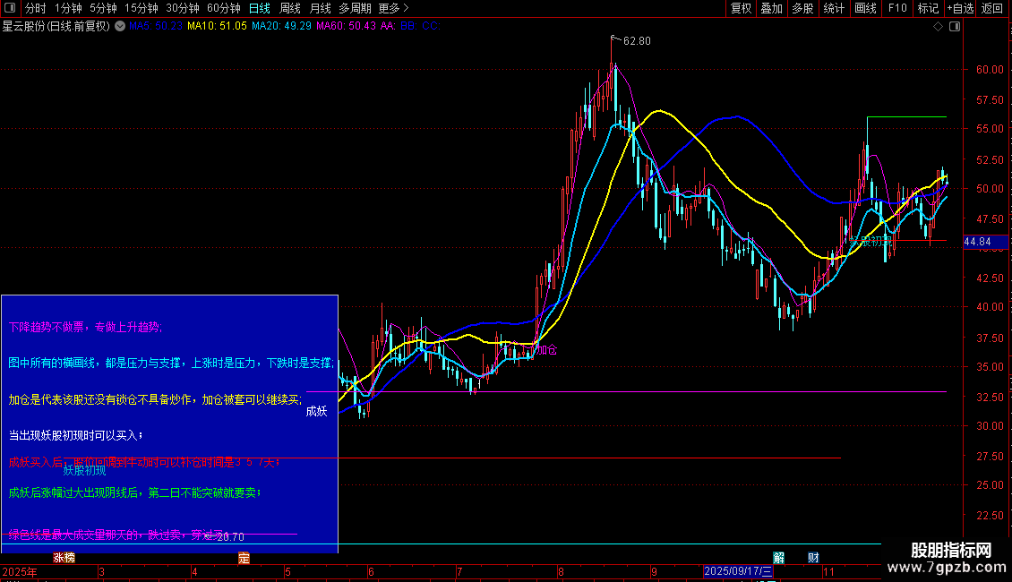 DRAWTEXT_FIX(1,0.008,0.95,0,'绿色线是最大成交量那天的,跌过卖,穿过买;'),COLORMAGENTA;