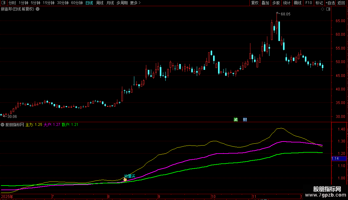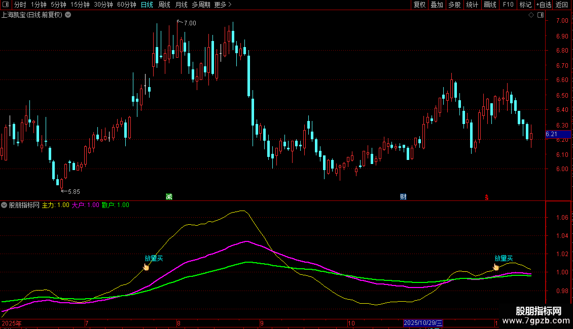自用指标,不一样的三线定强弱副图,有买点提示,感觉挺精准的!黄线、紫线、绿线从上到下多头排列时关注,出现“放量买”时入手,往往有比较好的收益,甚至可能有惊喜。本指标源码,无未来函数!