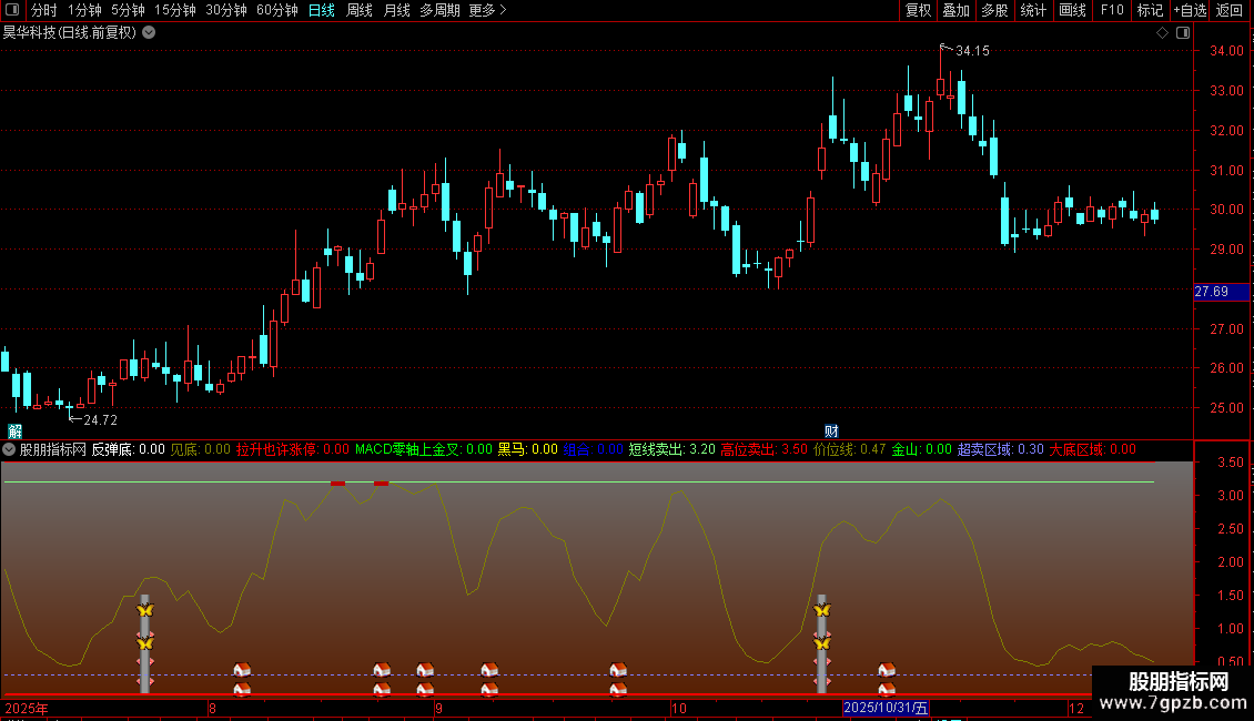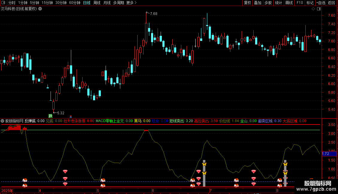 见底:IF(ZT6 AND CROSS(ZT4,ZT5) AND ZT4<50,1.5,0),COLORBROWN,NODRAW;