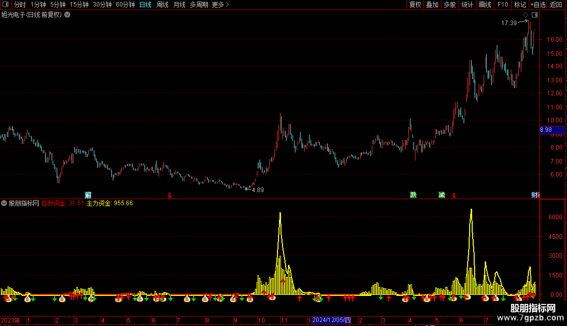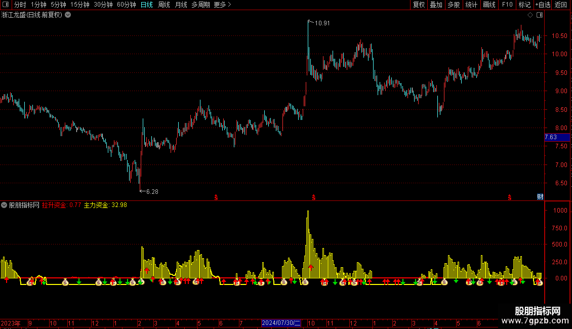 DRAWICON(CROSS(MAZL,ZLGJ) AND MA(C,5)<REF(MA(C,5),1) ,MA(拉升资金,5),2);