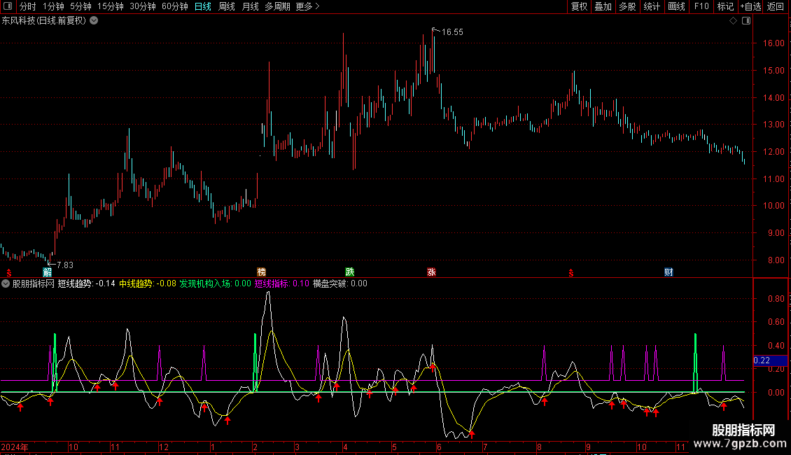 • 买入信号:当“发现机构入场”信号出现(绿色粗线),且短线趋势上穿中线趋势并伴随放量,是较好的介入点。