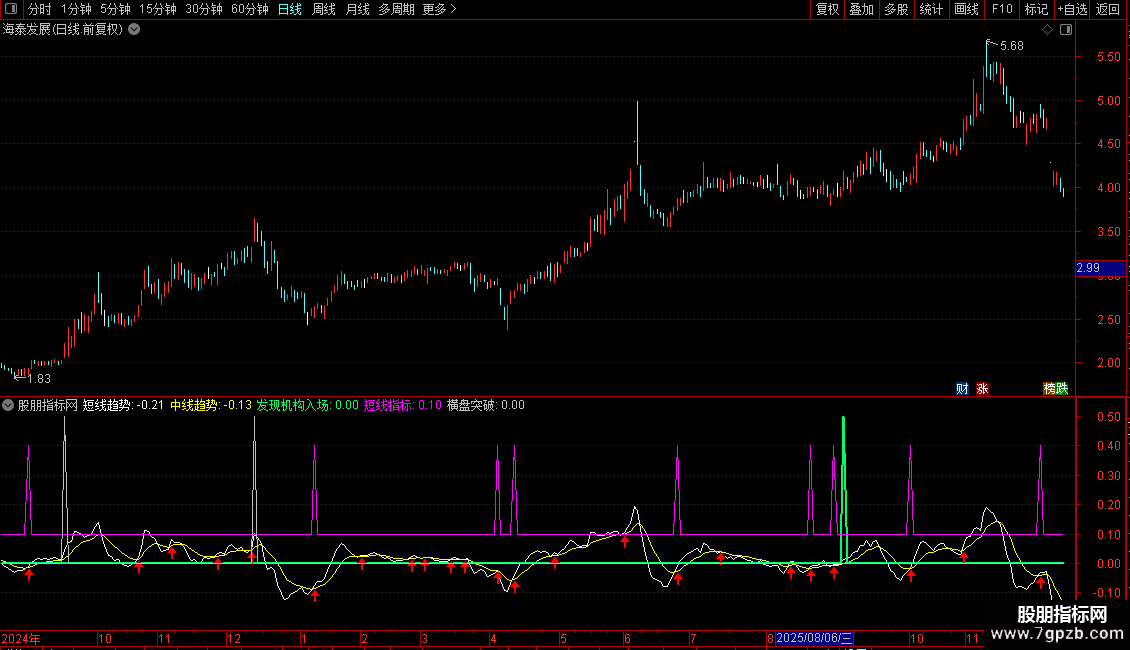 • 趋势判断:短线指标(紫色线)与中线趋势线的金叉死叉可辅助判断中短期走势,两者均大于零时表示趋势向上。