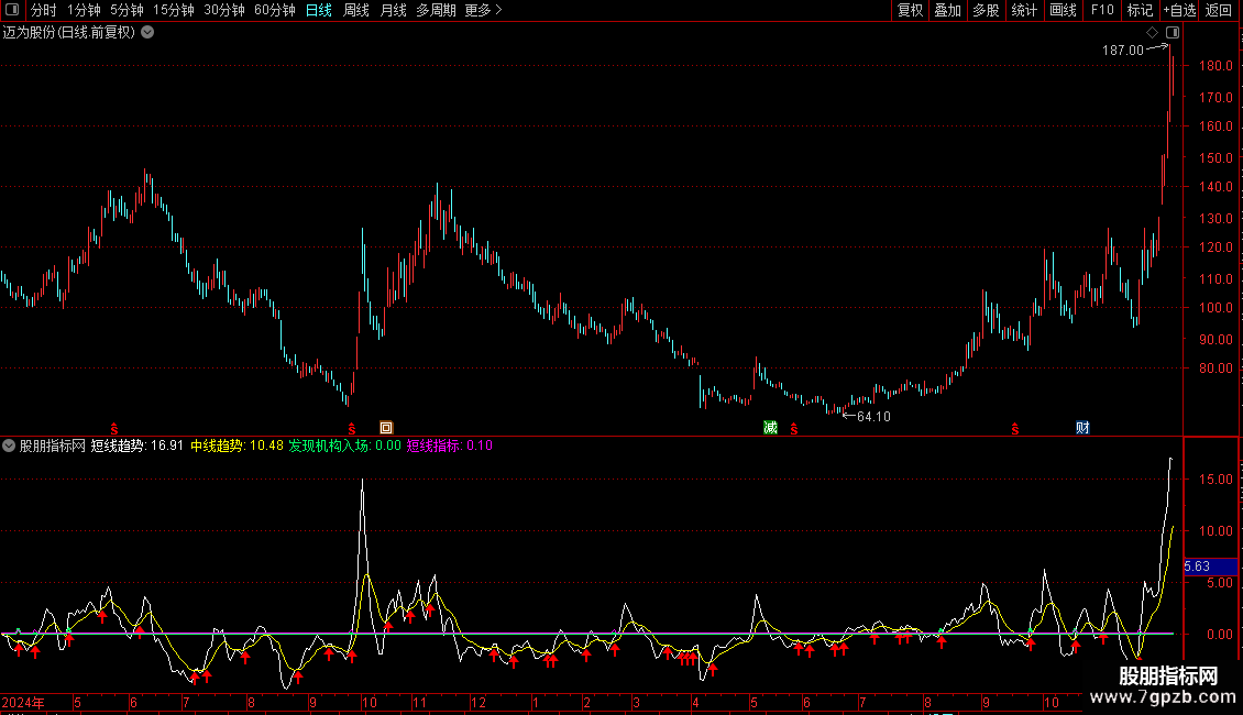 发现机构入场:IF((((((((O <= MA(CLOSE,5)) AND (O <= MA(CLOSE,10))) AND (O <= MA(CLOSE,30))) AND (C >= MA(CLOSE,5))) AND (C >= VARF)) AND ((中线趋势 - REF(中线趋势,1)) > 0)) AND ((短线趋势 - REF(短线趋势,1)) > 0)),0.5,0),LINETHICK2,COLOR66FF00;