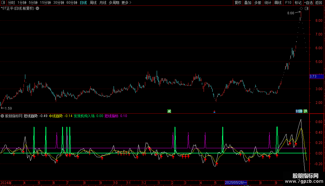 短线指标:IF(((((CROSS(短线趋势,中线趋势) AND (短线趋势 < 0)) AND (中线趋势 < (0 - 0.2)+4)) AND (VAR1 > 45)) AND ((中线趋势 - REF(中线趋势,1)) > 0)),0.4,0.1),COLORMAGENTA;