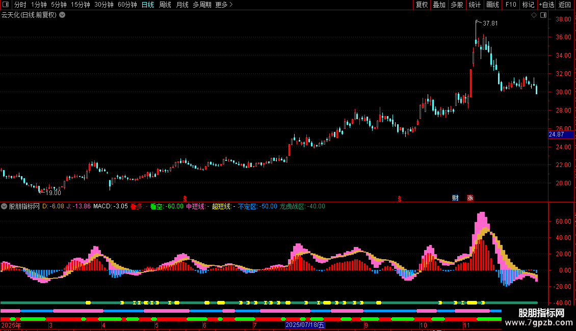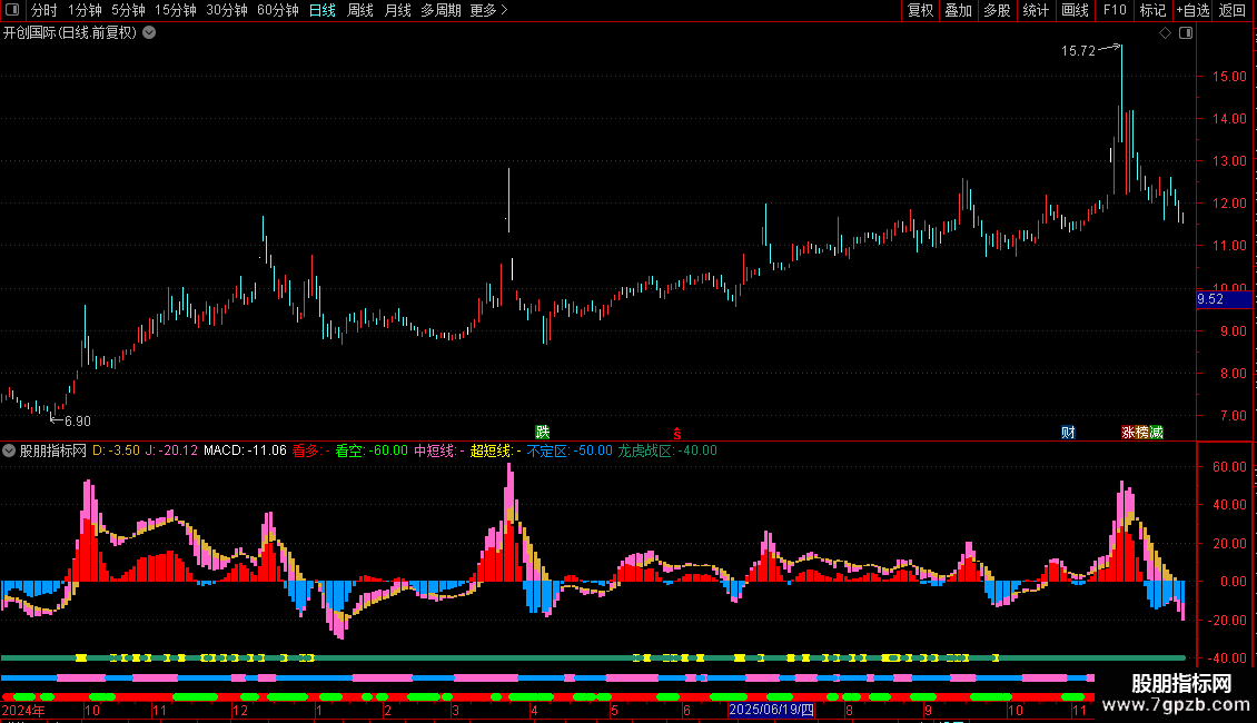 中短线:IF(J>D,-50,DRAWNULL),LINETHICK7,COLORCC66FF;