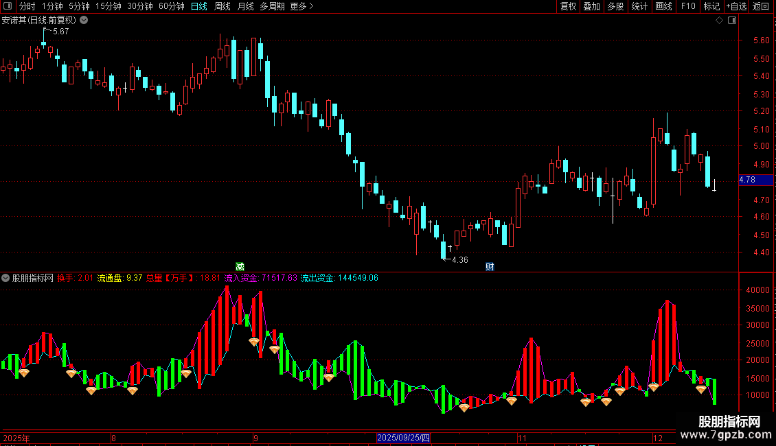 STICKLINE(流入资金>流出资金,流入资金,流出资金,1.6,0),COLORRED;