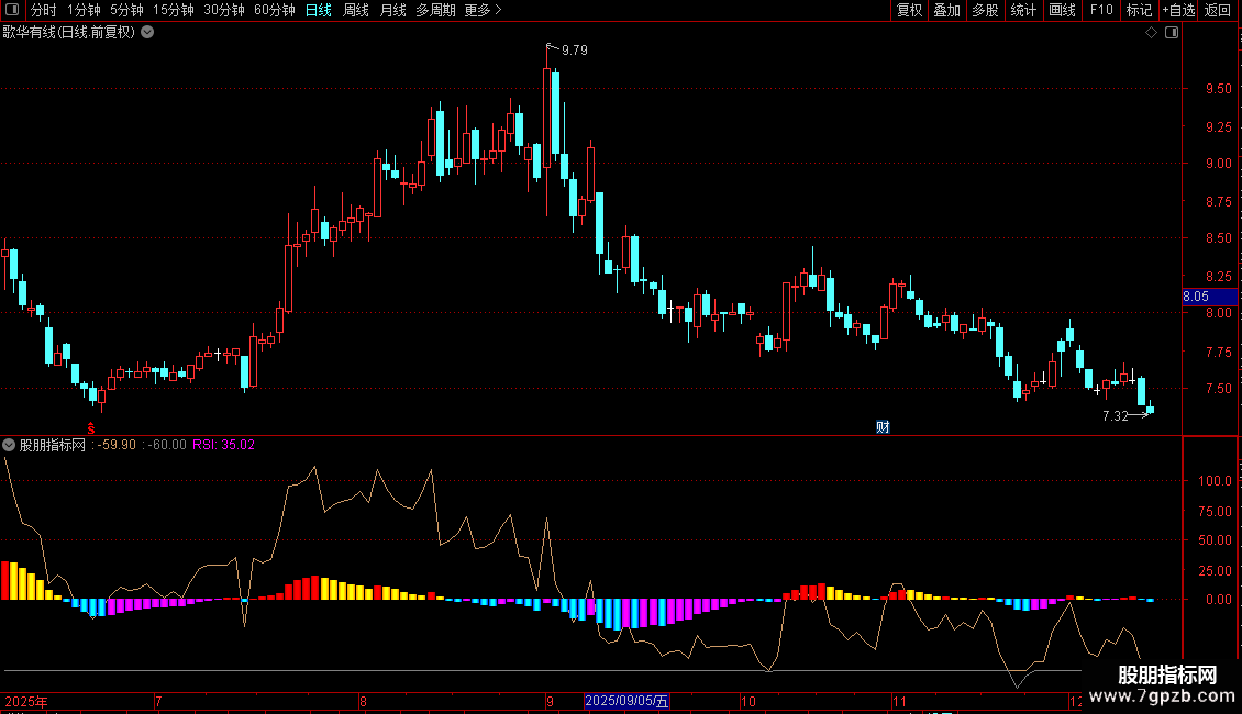 STICKLINE(MACD<0 AND MACD<REF(MACD,1),MACD,0,1.6,0),COLORFF9900;