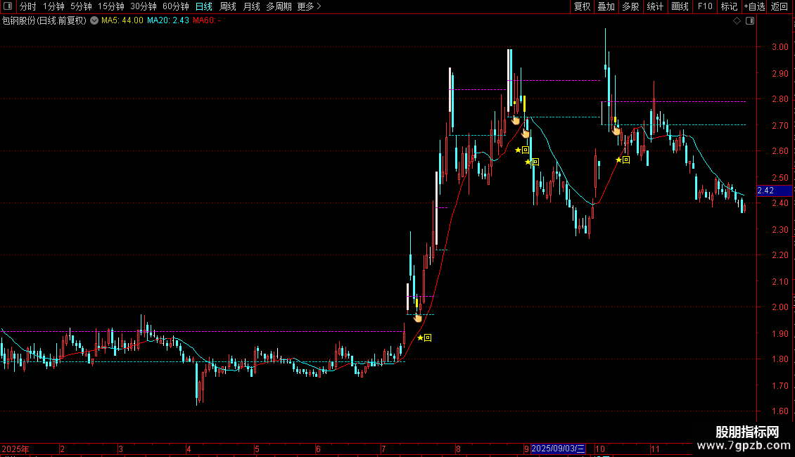 最后涨停距今数:BARSLAST(ZBGS3),NODRAW,COLOR00CCCC;
