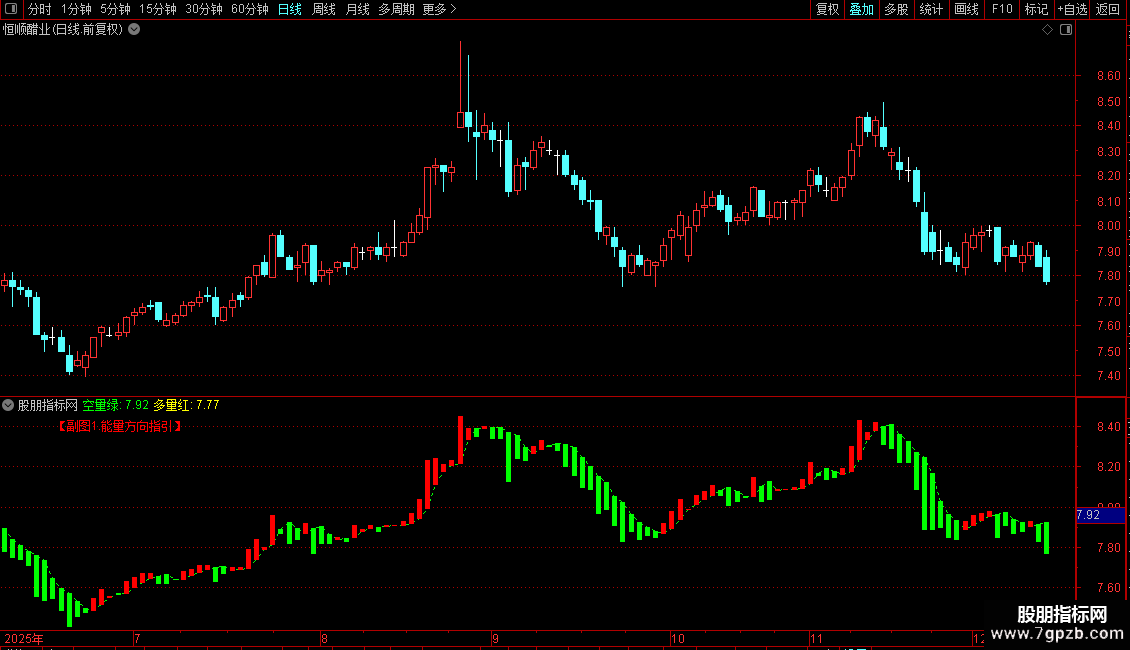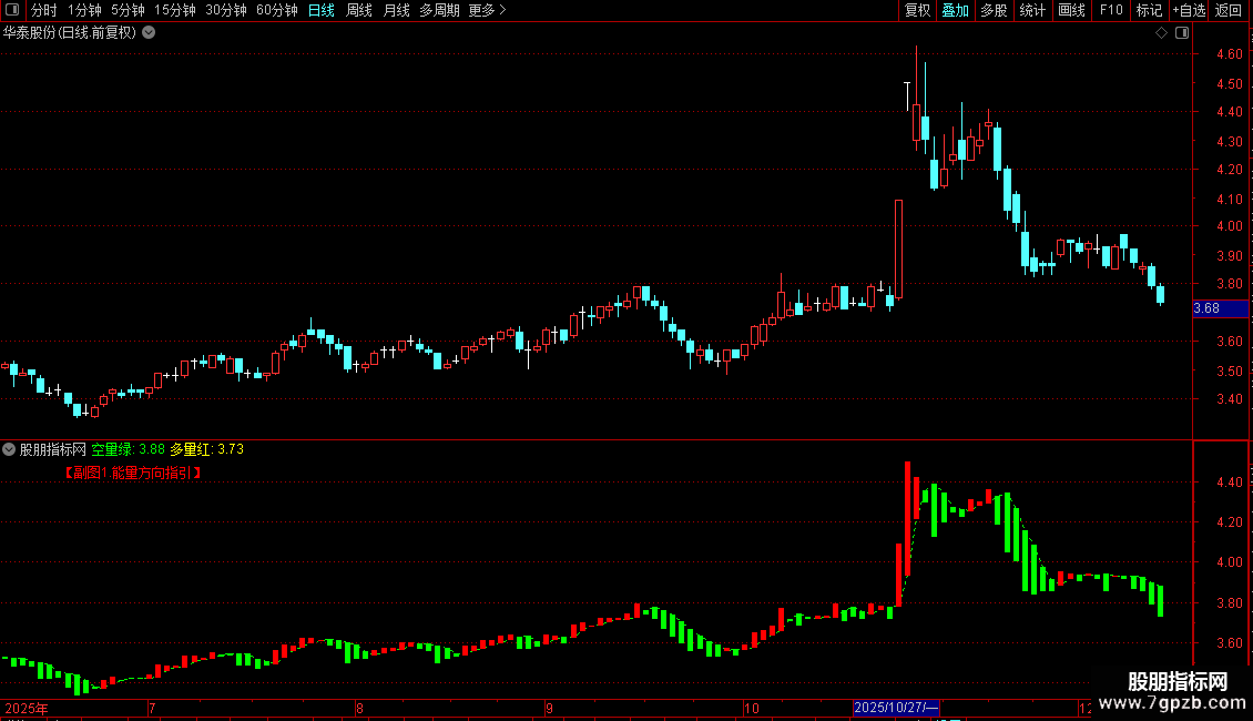 1. 在副图加载指标,观察柱状线颜色切换。