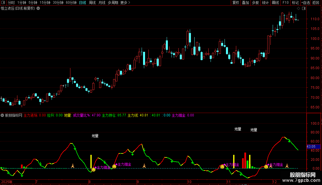 指标通过价格波动、成交量结构与多周期动量,综合判断主力资金是否正在低位吸筹或启动拉升。当股价处于相对低位、出现缩量企稳且主力资金线由负转正并上穿其均线时,系统标记为“主力掘金”信号,提示潜在的启动机会;同时结合地量和超卖状态辅助确认底部区域。操作上可在信号初现时分批布局,配合主力持仓强度和趋势过滤,适合中短线捕捉主力介入初期的个股。