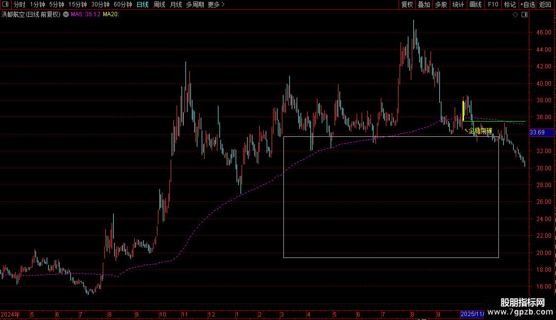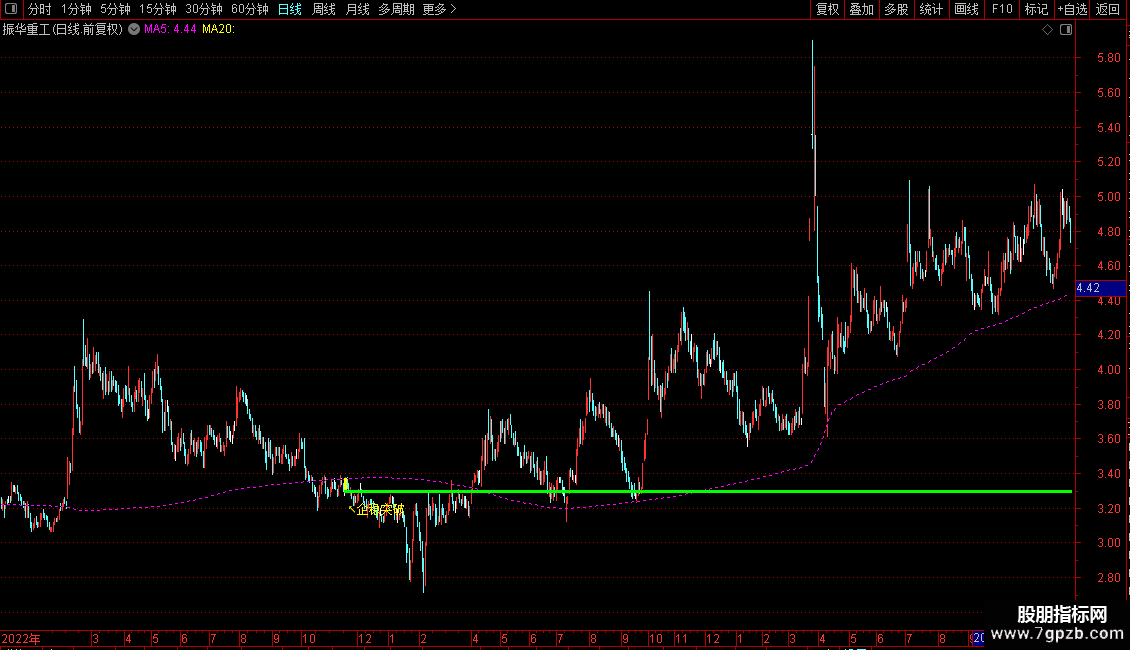 3、在信号K线的最低价位置画绿色横线,作为后续调整的重要参考位。
