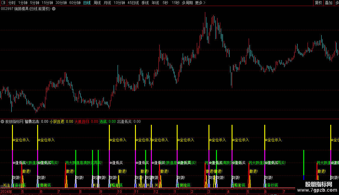 1. **买入信号**:出现“☆全仓杀入”(多周期ZIG共振金叉+下跌反转)、“突袭!”(短期趋势拐头向上)、“准备抄底”(底部拐点临近)或“☆逢低买”(ZIG金叉)时,可结合K线形态确认进场;