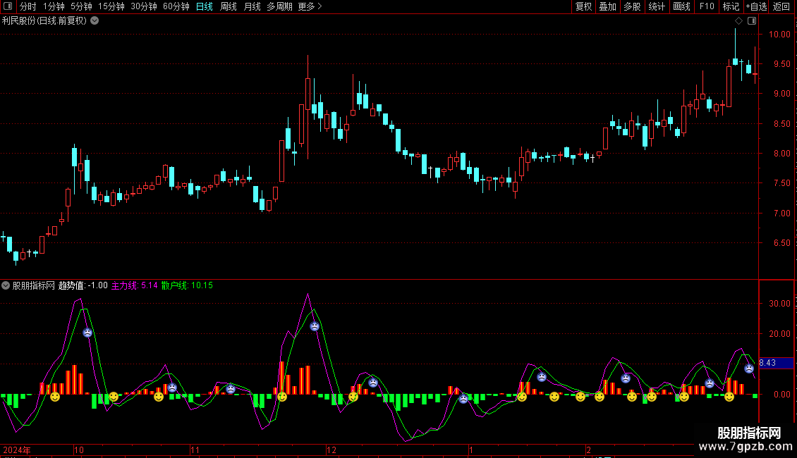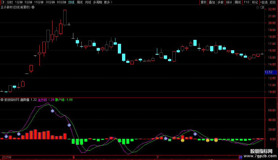 指标通过价格与短期均线的偏离程度,衡量市场短期强弱,并结合类似MACD的动量结构,识别主力资金的活跃状态。主图以彩色柱状显示多空力量对比:黄色至红色代表强势上涨,绿色系代表弱势回调。同时引入“主力线”和“散户线”,分别反映资金主导趋势与跟随情绪。操作上,当主力线向上突破且价格站稳均线上方时,视为积极信号;若散户线反超主力线且主力线处于高位,则警惕短期回调。配合图标提示,便于捕捉主力启动或退潮的关键节点。