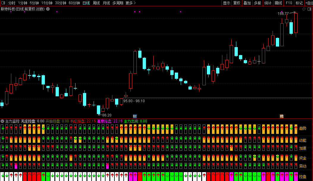 指标融合价格、成交量、筹码分布与多周期动量,综合判断市场运行状态。通过加权均价与均线偏离度识别资金成本变化,结合多个周期的随机指标和趋势线,分别评估趋势方向、动能强弱、上涨加速、资金流入及主力控盘程度。操作上,当多个维度同步发出积极信号(如趋势向上、动能增强、资金进场、控盘提升)时,视为较可靠买入时机;反之若出现背离或主力出货迹象,则提示谨慎或离场。界面以彩色条和图标直观展示各模块状态,便于快速决策。