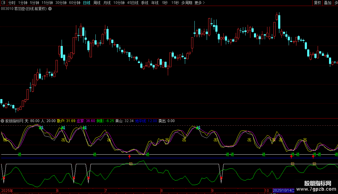 DRAWTEXT(CROSS(散户,庄家) AND 散户<50 AND 29<散户,20,'进')COLOR00FF00;