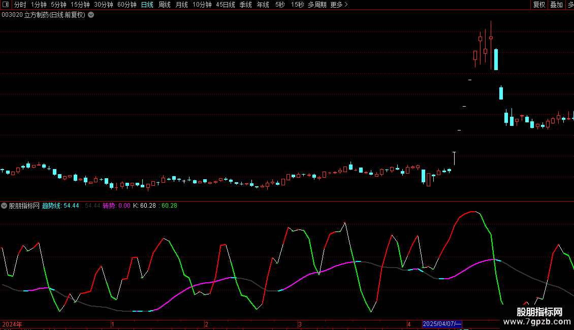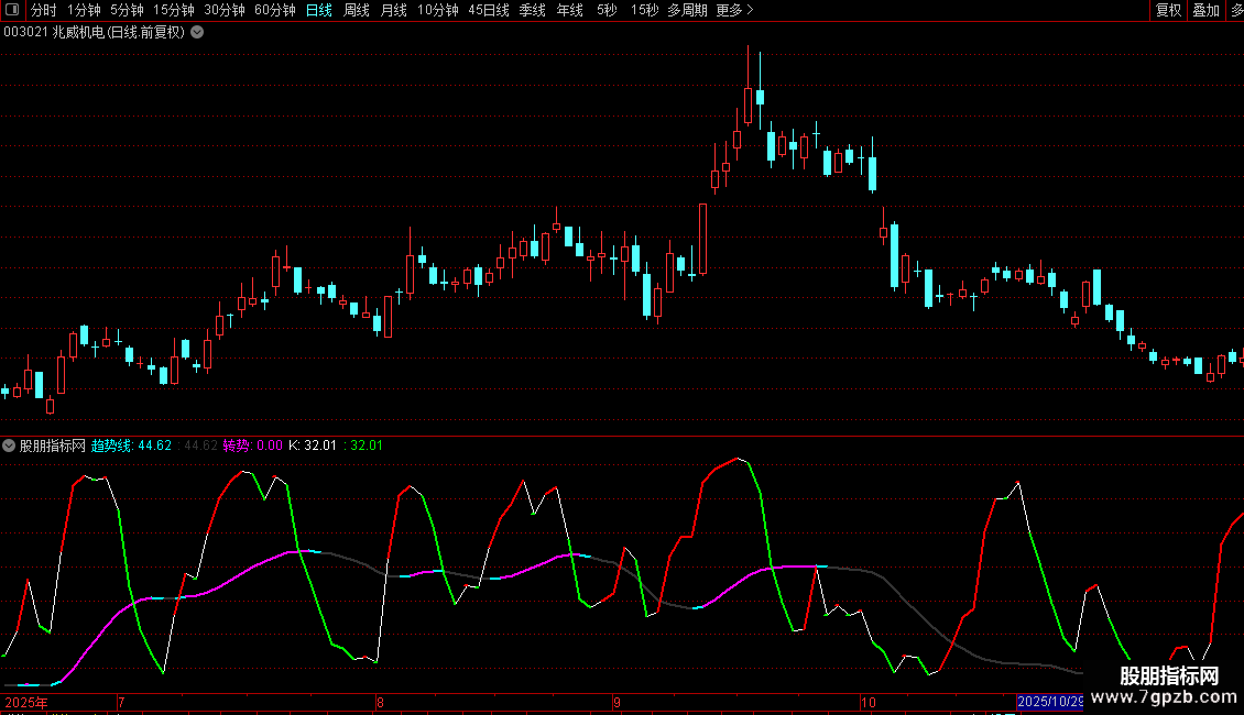 转势:CROSS(趋势线,REF(趋势线,1)),NODRAW,COLORFF00FF;