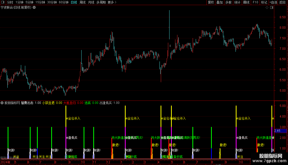 指标主要通过价格波动与ZIG锯齿波判断市场转折点,结合短期跌幅和形态识别,寻找低吸高抛时机。当价格连续低于前一日或前两日开盘且下跌时,系统监测潜在底部;一旦ZIG指标出现向上拐点,视为买入信号,并在多重周期共振时提示“全仓杀入”。同时,通过ZIG高点回落、操盘线金叉等条件提示止盈撤退或大跌预警,兼顾进攻与防守。策略核心是“跌后反转介入、涨后高位离场”。