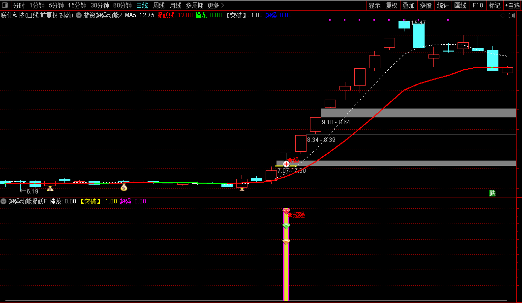 “超强动能”指标(亦称“最强动能”) 是一款集动能分析、强势信号识别、操盘线指引及趋势跟踪于一体的综合性技术辅助工具。其核心目标是识别市场中最高级别的动能信号,为使用者提供清晰的交易决策支持。