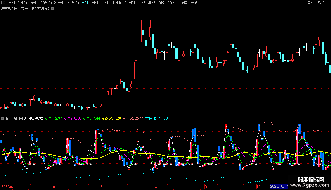 支撑线:MA(KML,21)-2.2*STD(KML,21),DOTLINE,COLORCYAN;