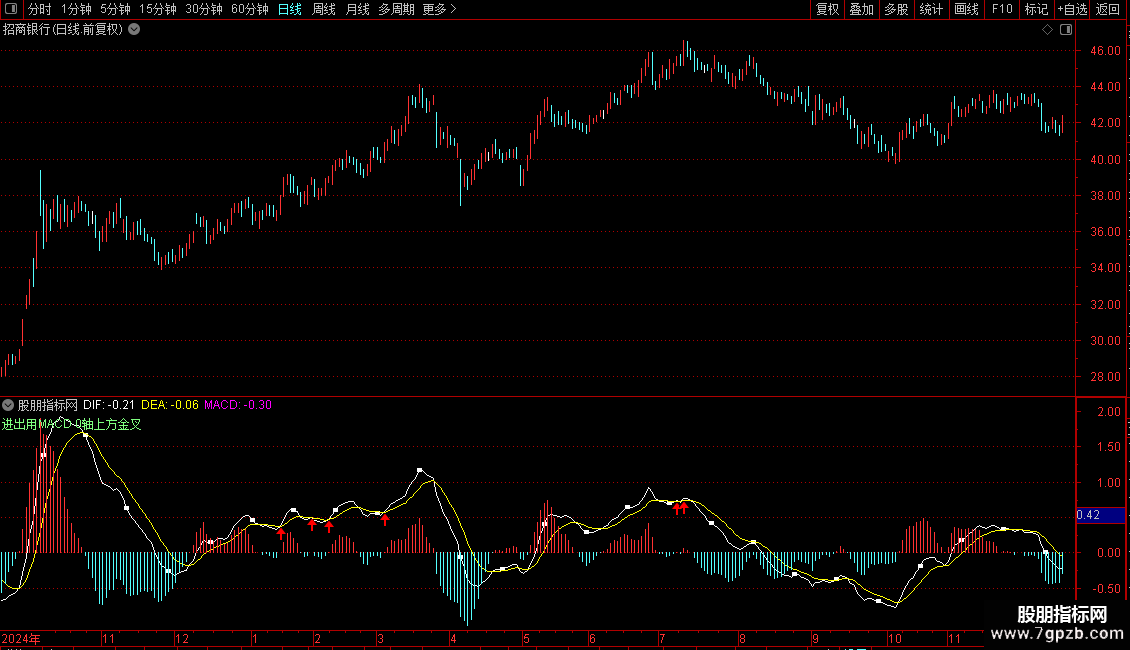 核心方法:将MACD参数放大5倍,获得类似周线MACD的数据形态,再结合原版MACD寻找买卖点。根据策略逻辑,当放大5倍周期的MACD双线上穿0轴后进行颜色标记,该模型理论强调周线DIF和DEA同步位于0轴上方,代表近期走势强势。买卖信号则依据日线MACD的水上金叉。