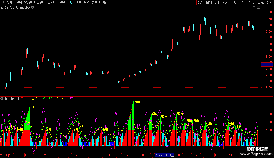 DRAWTEXT(REF(火,3)>0 AND REF(火,2)>0 AND REF(火,1)>0 AND 火=0 AND REF(火,1)>山,REF(火,1),'调整'),COLORYELLOW , ;