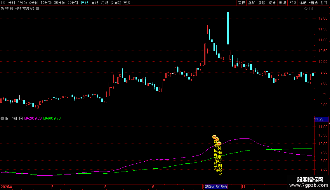 MA10:=MA(C,10)COLORYELLOW;