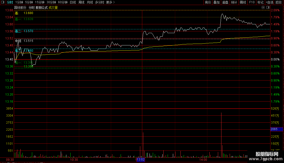 高低分割分时组主图指标是通达信软件中针对分时行情分析的实用工具,核心功能为基于当日分时走势的高低点数据,自动绘制黄金分割比例的分割线,并清晰标注 “高、中、低” 核心档位,以及 “高一、低一、高二、低二” 等细分分割位。该指标依托黄金分割的经典理论,以分时图中的当日最高价、最低价为基准,等关键黄金分割比例,自动完成画线操作,无需手动调整。画线结果直观呈现在分时主图中,“中” 位对应 0.5 分割线,是多空博弈的核心分水岭;“高一 / 高二” 向上延伸至高位分割区,“低一 / 低二” 向下覆盖低位分割区,快速识别分时行情中的支撑与压力位,为判断提供清晰的参考