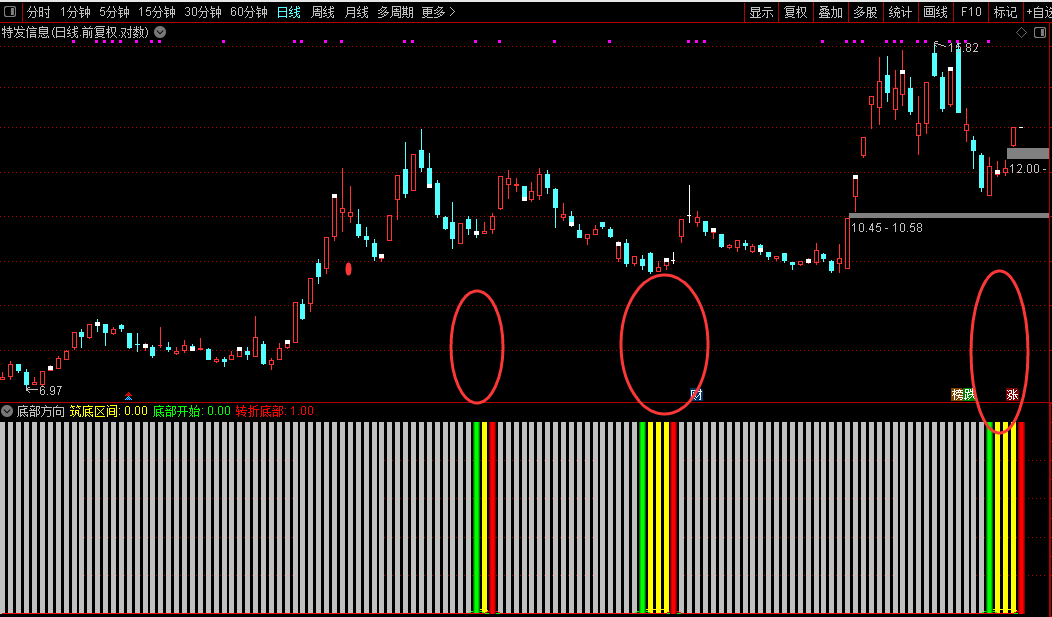 其中,绿色柱代表筑底开始,是极具价值的抄底选股信号;黄色柱表示市场正处于筑底状态,适合观察与布局;红色柱则明确提示底部已经形成,即将开启反转行情,是短线或中线介入的黄金时机。
