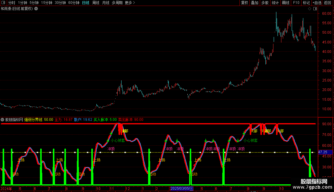 DRAWTEXT(CROSS(主力,65) AND 散户<主力,55,'冲顶 '),LINETHICK2,COLOR9933FF;
