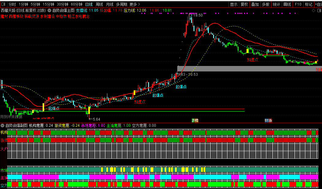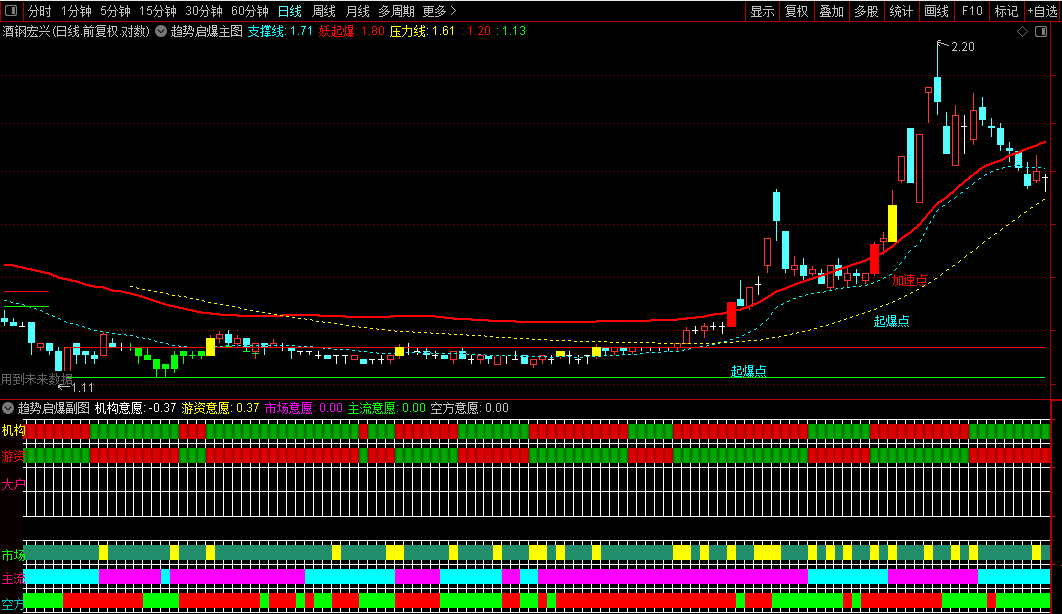 机构与游资意愿:位于图表上半区,通过红绿柱体显示大资金活跃度,同步翻红时资金合力较强。