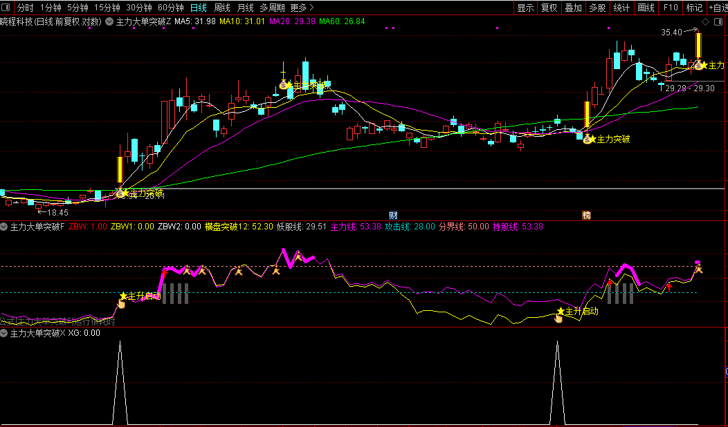 本套公式由主图、副图与选股三部分组成,专为识别主力资金强势介入、横盘蓄势后的突破行情而设计。