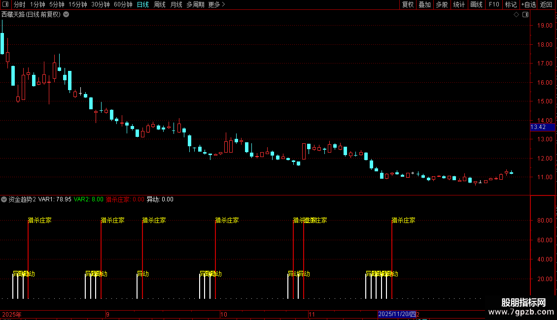 指标通过比较股价在近期高低点区间中的相对位置,构建出两条平滑曲线,用以捕捉短期价格动能的变化。当快线向上突破预设阈值时,视为强势信号,提示“猎杀庄家”;当指标回落至低位区域,则标记为“异动”,暗示市场可能出现异常波动或主力动作。整体策略偏向短线交易,适用于震荡或启动初期的行情识别。