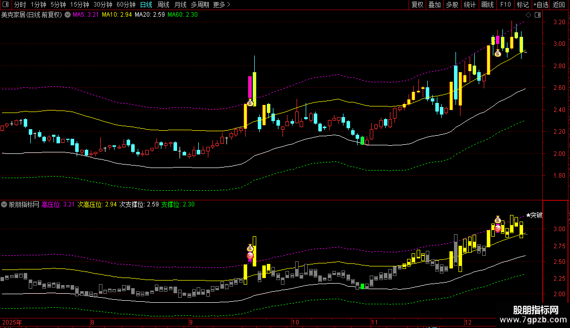 2.指标依据趋势强度级别进行判断。当趋势强度达到4级时,会在高位触发洋红色柱子,且首次出现4级强度时叠加“钱袋子”标志,此为核心的中线趋势启动信号。