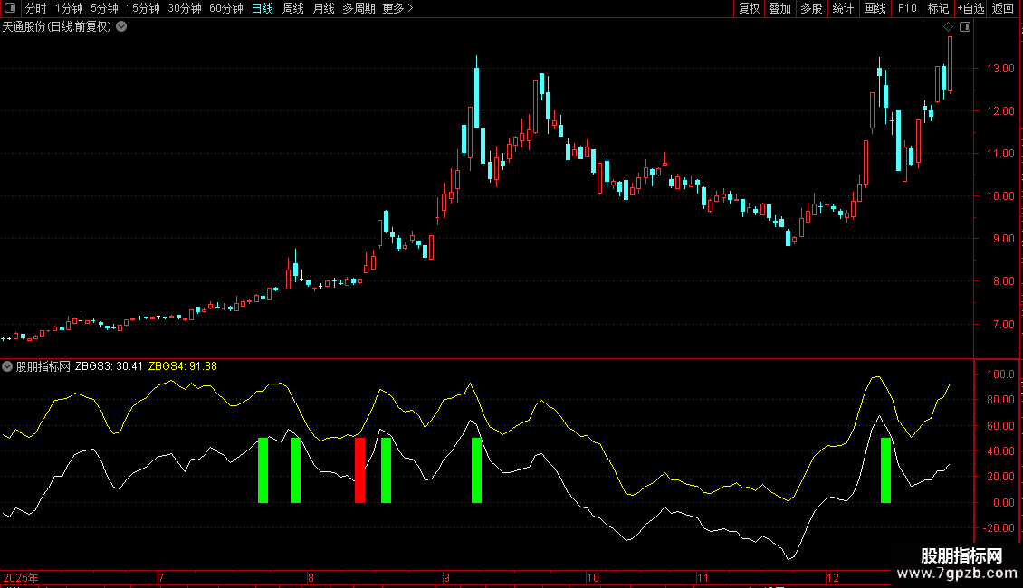 • 买入信号:出现彩色柱状图时,表明符合多项技术买入条件