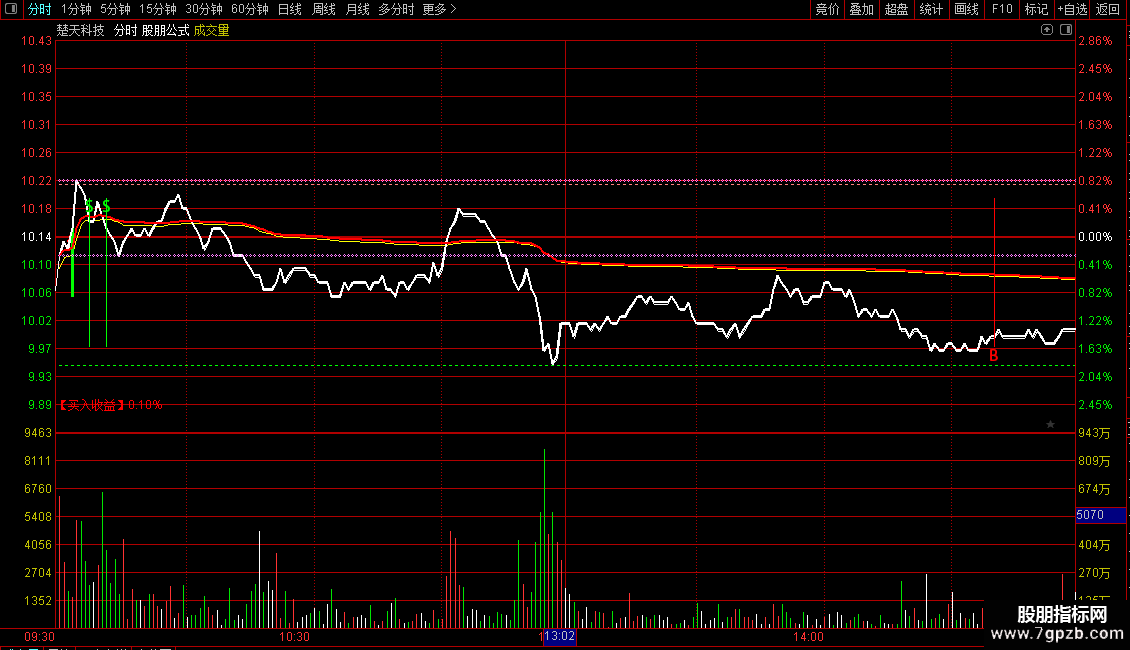 DRAWTEXT(分时追踪7 AND 分时追踪6< 1.06 AND 分时启动>DYNAINFO(3),C,' ')COLORGREEN;
