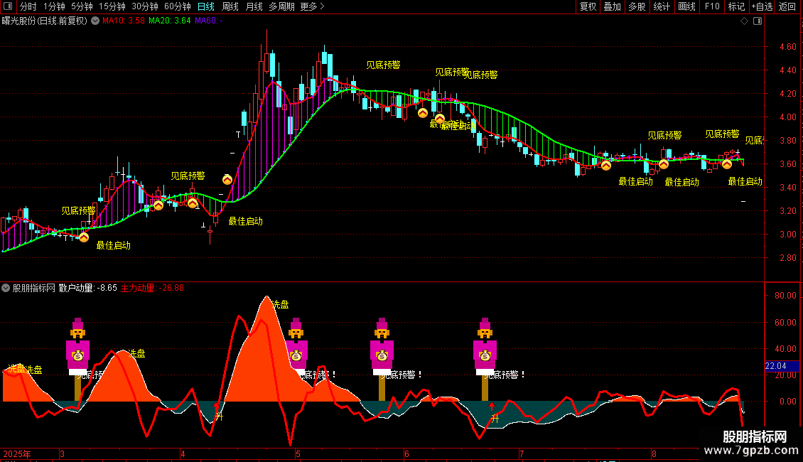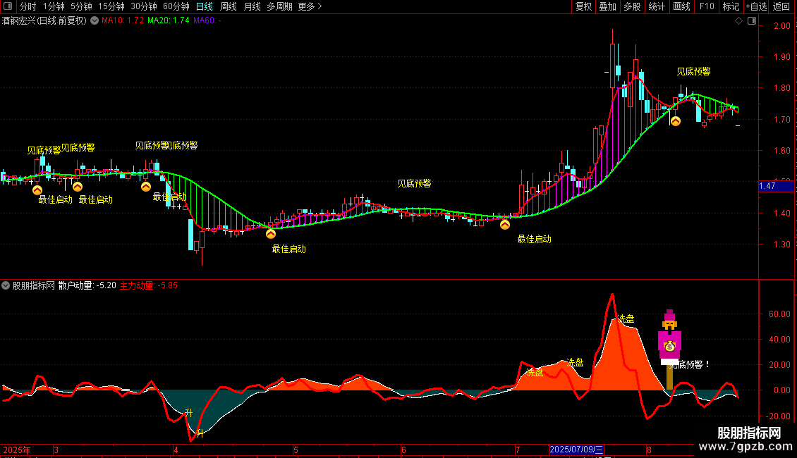 主要含义是通过多周期信号共振,精准捕捉超短线强势股的见底反转与启动时机,并识别上升途中的洗盘行为。包含见底预警和最佳启动两个核心提示。当趋势跌至阶段性底部区域时,出现见底预警信号;确认反转后,在趋势加速起点给出最佳启动上车提示。出现财神图标时,代表资金异动,往往是机构或大资金开始介入的信号,助力超短线精准。