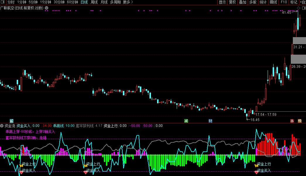 原资金流指标虽然有一定的实战作用,但是可能要表达的东西过多,导致线条零乱,看的人眼花缭乱。于是删繁就简,取其关联度较高的几个线条,其中的流金流用竖条表示,看起来要觉得比原来的方便多了。再加了二个选股信号,但是选股信号的通病都一样:准确度一般。但是可以在自己的自选股和热门股作为参考。