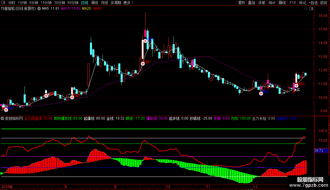 3、当“主力资金”上行到“即将爆发区域”时--加仓,主图上显示“加2”信号标识;信号可选股;