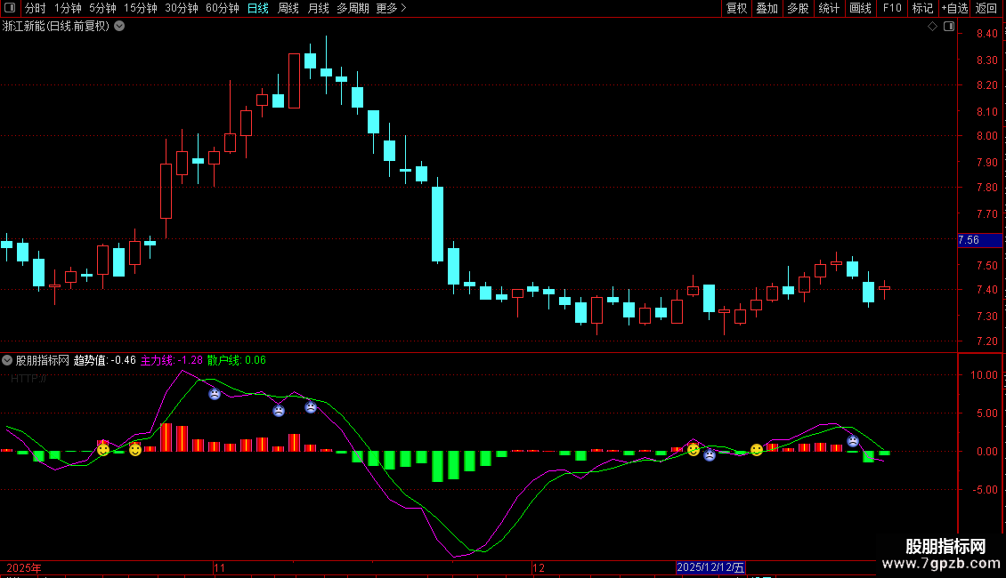 2、当指标出现笑脸图标时,为短期强势启动买入信号;紫色线上穿红柱或绿色线,表明行情走强;若紫色线下穿绿色线,则提示注意止盈离场。