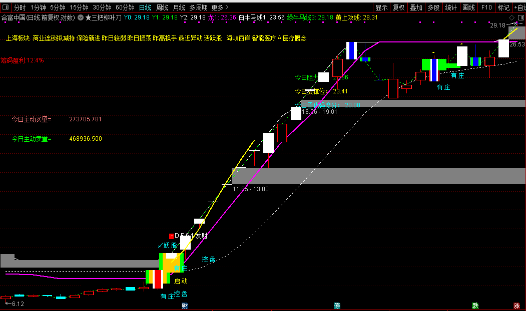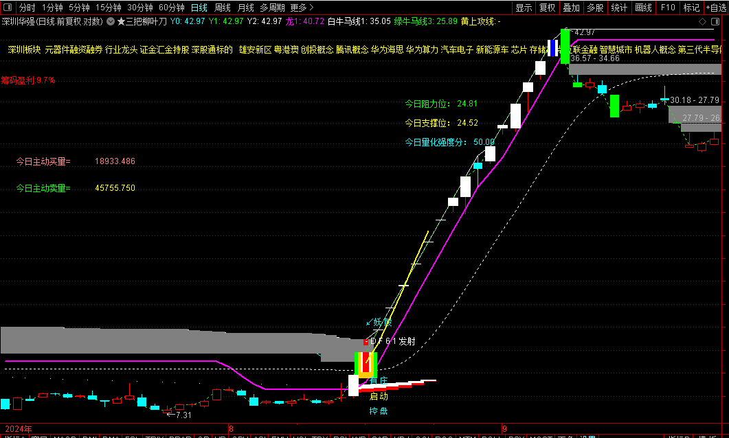 2024年8月16日: K线站上游资情绪线(白虚牛马线)并受到白红柳叶刀的均线托底支撑,说明股价在均线上方附近开始站稳走强。同时股价左侧的最大牛股急升线}Y0线(灰色柳叶刀),也是比游资情绪线(白虚牛马线)位置更高的拉升阻力线。      要点:1、灰色柳叶刀消失。2、同时下方也受到三把柳叶刀的均线支撑。3、彩色共振K线出现,波段拐点来临。