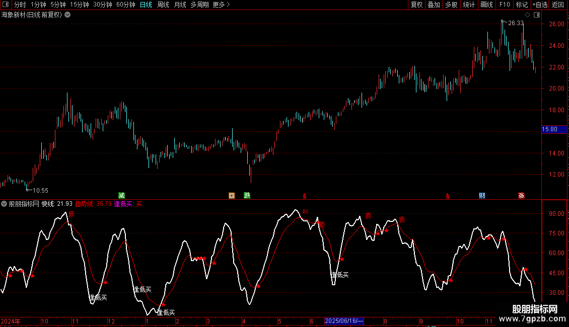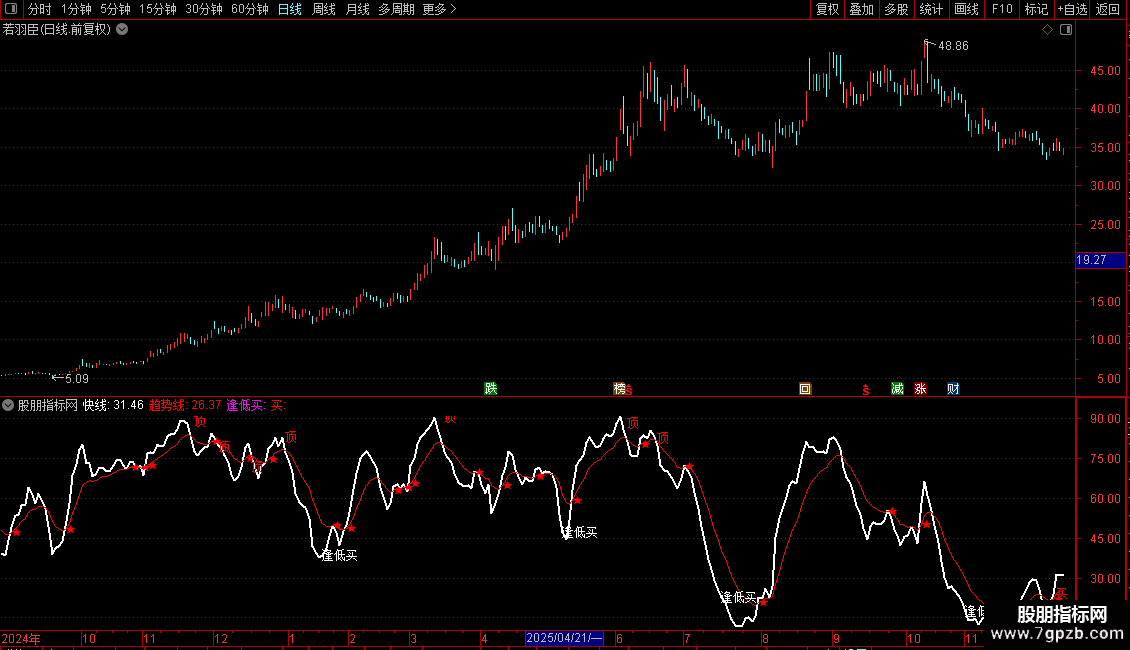 逢低买: DRAWTEXT(REF(CROSS(趋势线,快线),82) AND 趋势线>1.3*快线,快线,'逢低买'),LINETHICK1;