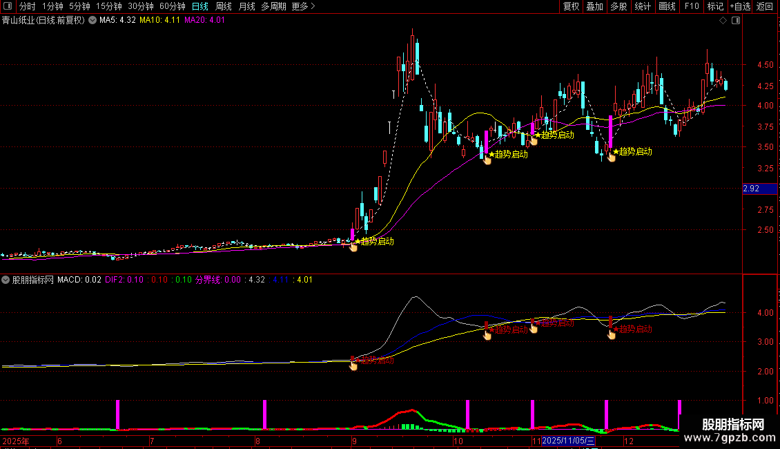 DRAWTEXT(FILTER(CROSS(ZBHJ1,ZBHJ4),8) AND CLOSE/REF(CLOSE,1)>1.05,L,' ★趋势启动'),COLORYELLOW;