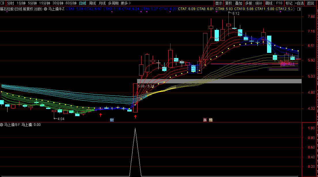 这个“马上擒牛”指标是专门为快速捕捉强势股设计的实用工具。它通过主图和副图共同发出信号,帮你一眼看清买卖时机。