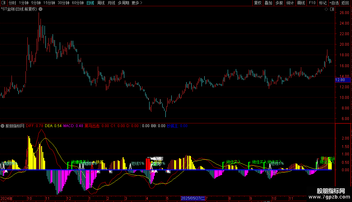 DRAWTEXT(((CROSS(MACD,DIFF) AND (MACD >= (0 - 0.05))) AND (MACD <= 0.02)),0.23,' 金叉'),LINETHICK4,COLORFFFFFF;
