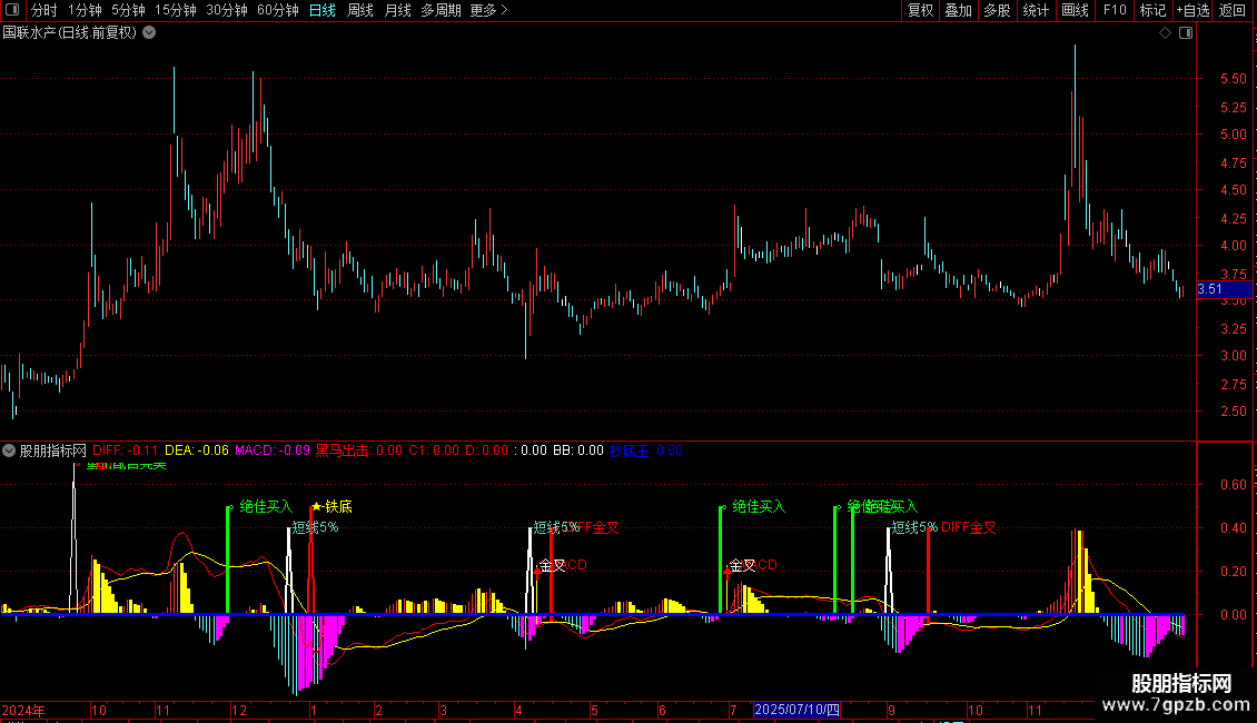 (0.4 * ((CROSS(操盘手,MACD) AND (MACD <= (0 - 0.11))) AND (LOW <= 下))),LINETHICK2,COLORFFFFFF;