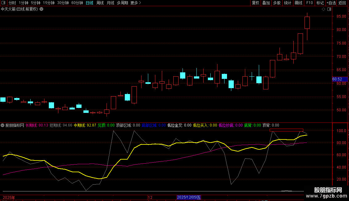 顶部区域:(中期线<REF(中期线,1) AND REF(中期线,1)>80) AND (REF(短期线,1)>95 OR REF(短期线,2)>95 ) AND 长期线>60 AND 短期线<83.5
