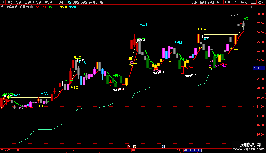DRAWTEXT(减仓,HIGH*1.02,'◆风险'),COLORCYAN;