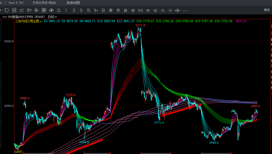 “三和均线交易主图”是一款融合短、中、长期多组均线的智能交易系统,通过三重周期(5–15日、60–80日、230–270日)EMA与MA均线组合,构建出高灵敏度的趋势识别框架。公式以青色、绿色、蓝色分别标识不同周期均线,并用洋红/红色高亮连续3日上涨的均线,直观反映各周期动能方向。