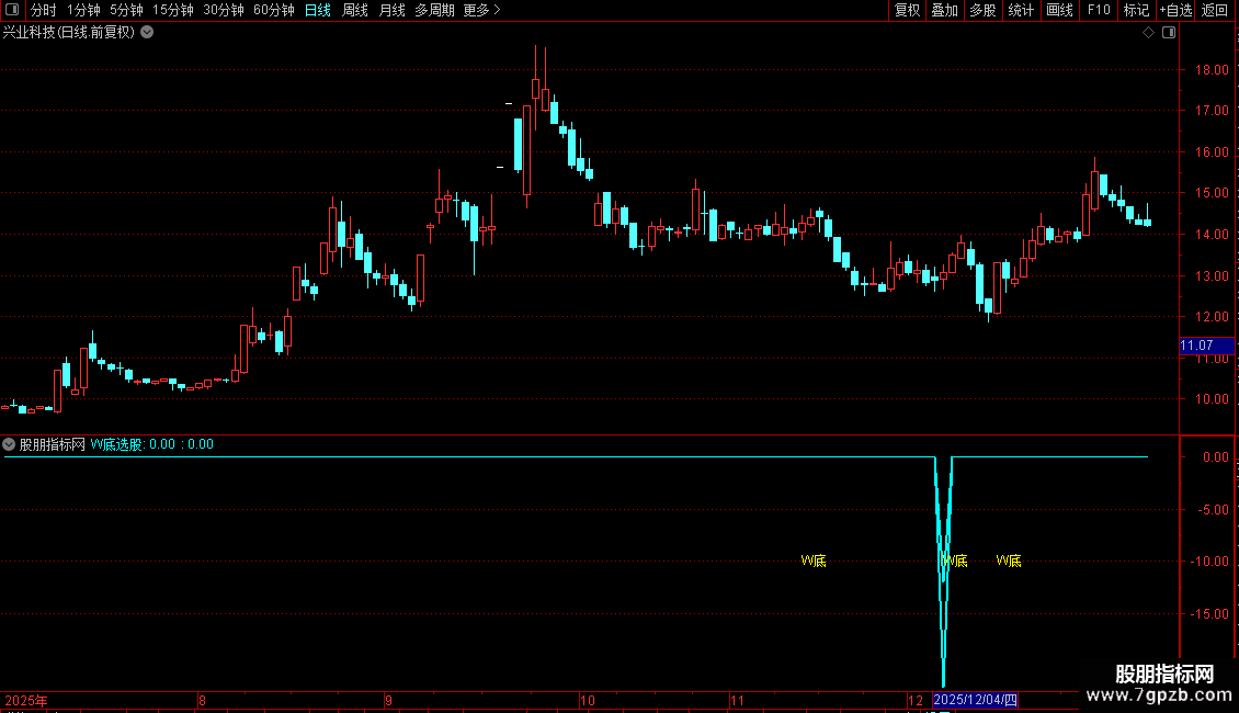 指标基于MACD构建,主要识别特定形态的“W底”反转信号。其核心逻辑是:当DIFF在零轴下方上穿DEA形成金叉,并结合DEA由正转负的背景,系统会累计符合条件的金叉次数;一旦累计次数比历史最高值多出两次,且当前次数较前一日增加,即触发选股信号。此时在图上标记“W底”字样并输出固定数值提示。操作上,投资者可将此作为潜在底部反弹的参考依据,配合其他确认信号择机介入。