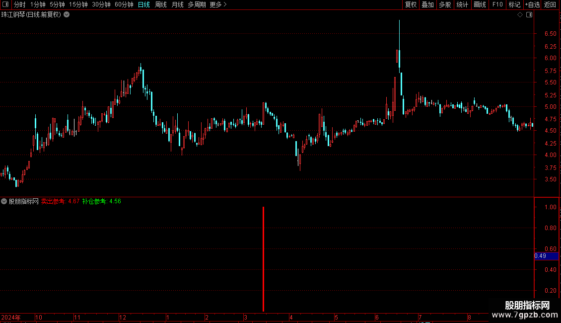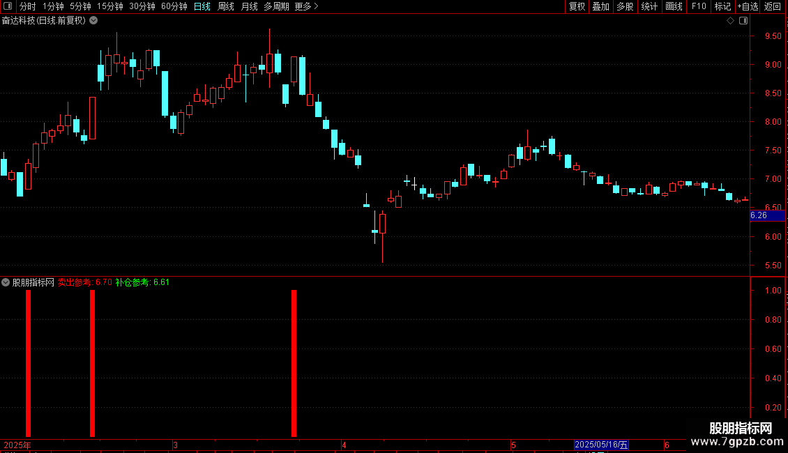 指标主要帮助识别股票短期顶部和底部,提供卖出和补仓参考。通过计算最高价和最低价的移动平均值来设定卖出和补仓的价格参考线,并结合价格突破、相对强弱指标变化等条件判断买入时机。特别地,当市场出现连续弱势后首次强势反转时,会发出明确的买入信号,以蓝色柱状图显示,辅助投资者捕捉短线反弹机会。